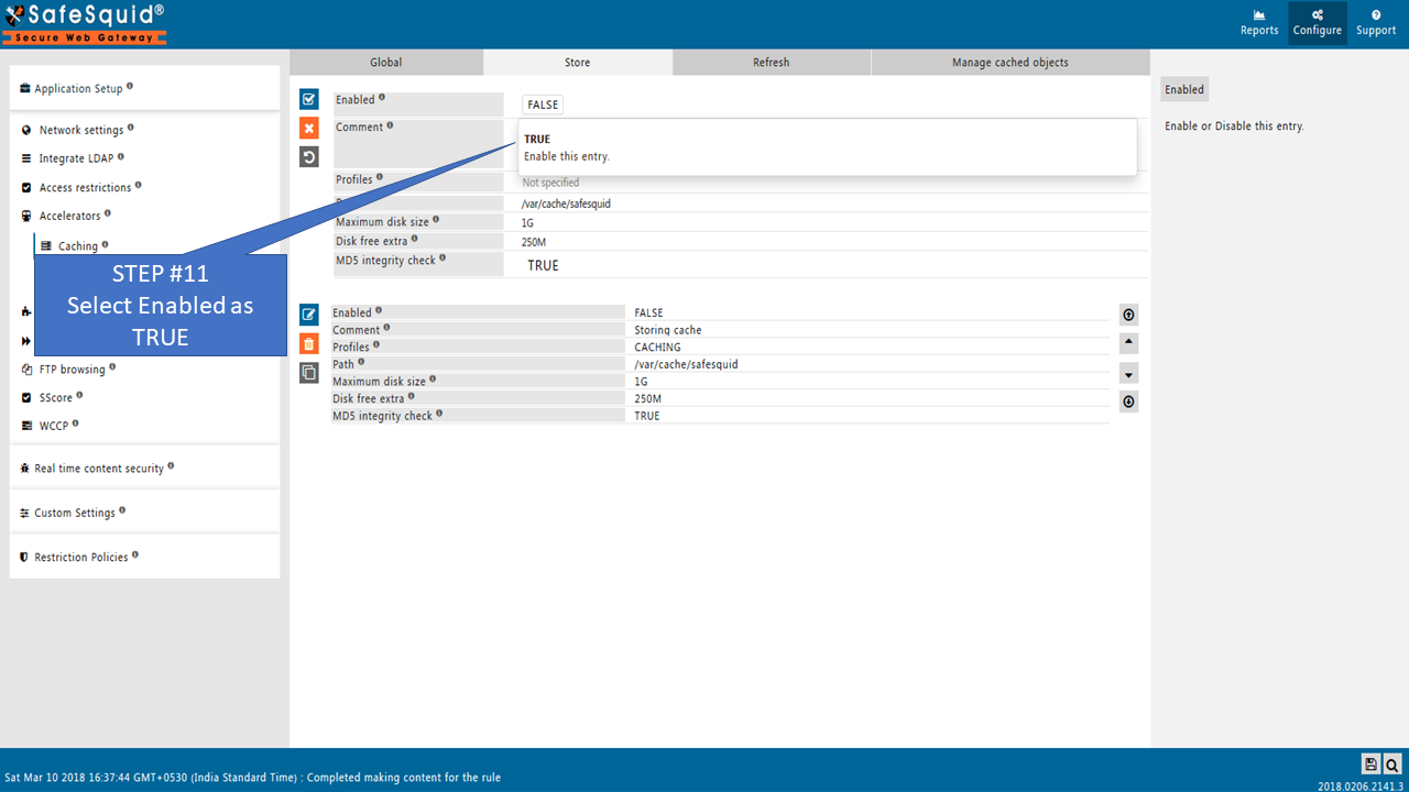 Content Caching improves bandwidth efficiency. A page or file, when requested by a user, is served to the user and a copy of it is also maintained locally in the cache. So, when a request is made to fetch the same page or file, it is served with the local copy, instead of 'a fresh fetch'. SafeSquid has a very neat, efficient and manageable Content Caching system.